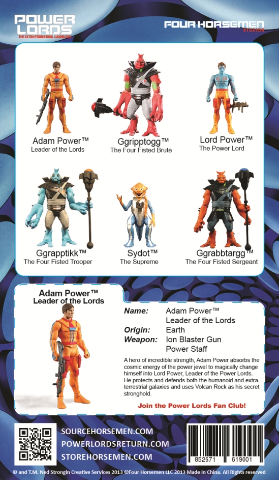 Four Horsemen Toy Design was kind enough to allow Powerlordsreturn.com to debut their all new packaging. We will start our reveals with the packaging for Adam Power. The packaging art is being done by the supremely talented Nate Baertsch (of Seventh Kingdom and Gothitropolis fame) and really captures a nice old-school sci-fi vibe. It is also important to note that Adam Power’s bio on the back of the packaging states that he hails from Earth, not from Toran, which means that his bio follows the original toy cardback version of his biography and not the DC Comics version which states that he is originally from Toran.